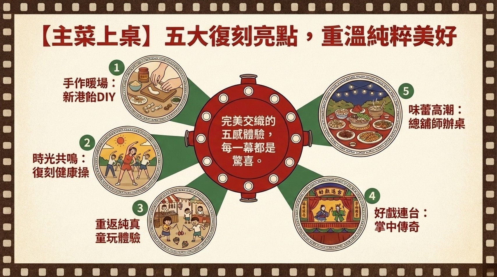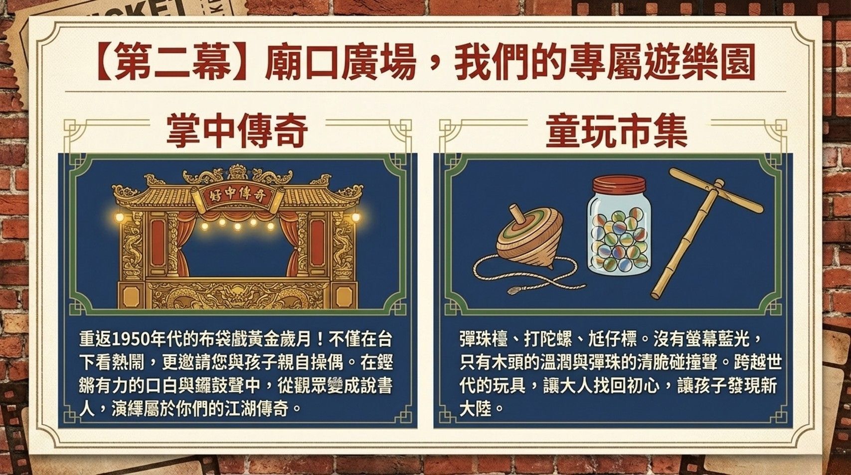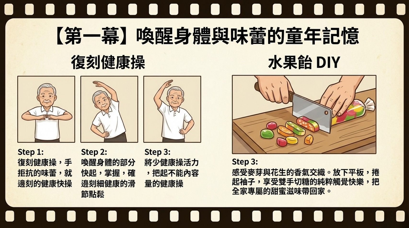 對孩子來說:當他們親手操縱布袋戲偶、學著跳我們年代的國民健康操、看著總舖師在大鍋前翻炒辦桌菜時,那些傳統美學會變成他們身體裡的記憶。他們會知道,原來「台灣味」可以這麼酷、這麼好玩。