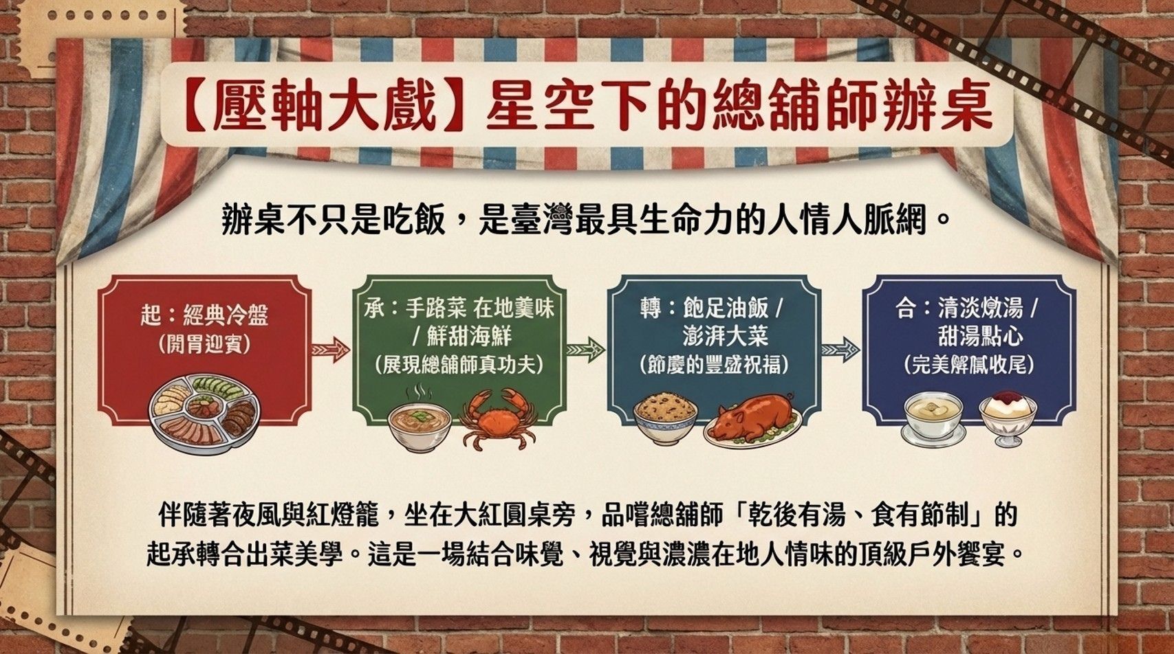 17:30 - 19:00|總舖師開火:廟口辦桌大晚宴(同場加映:野台電影播放)