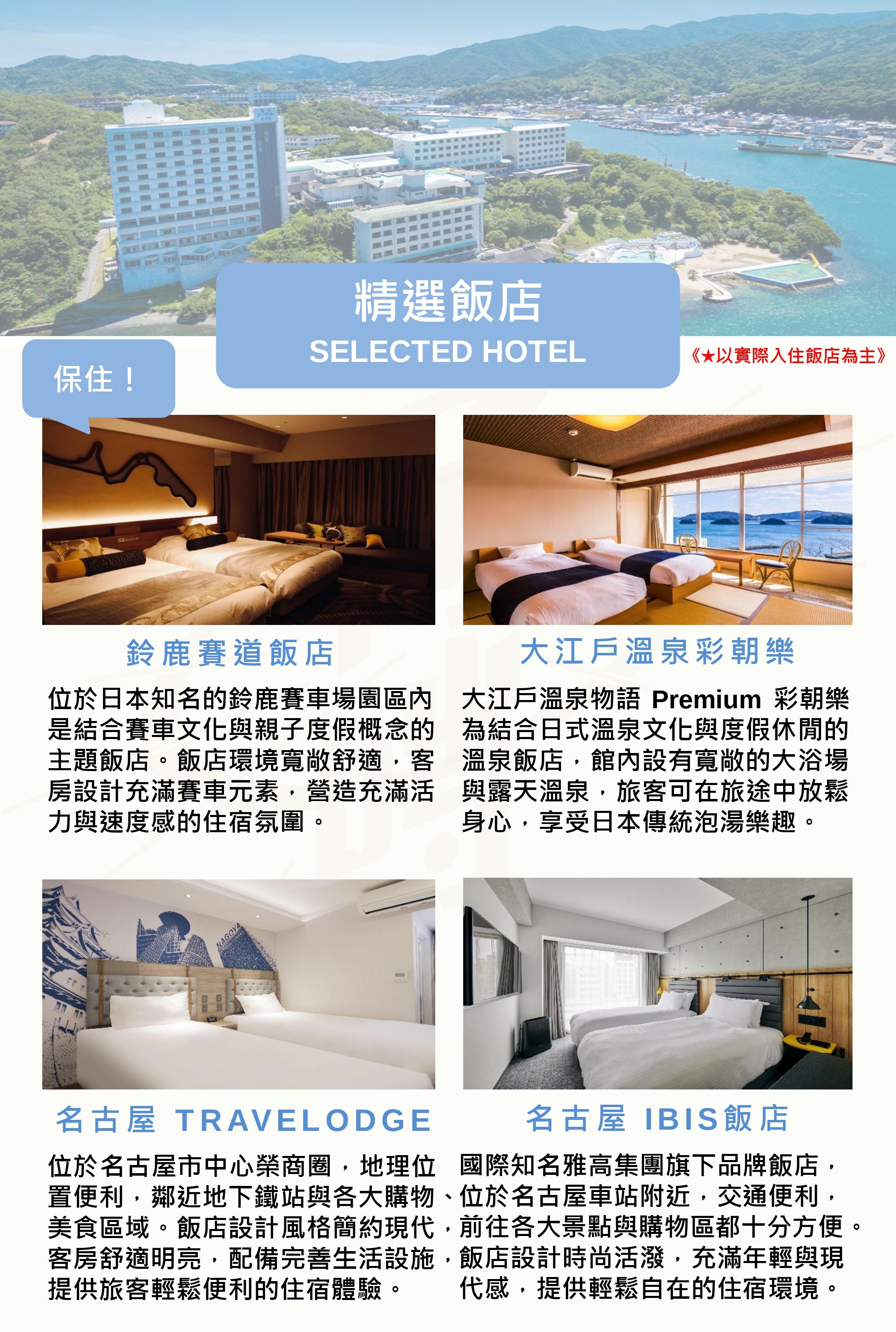 住宿:⼤江⼾溫泉彩朝樂 或 伊勢志摩MERCURE 或 ⿃⽻海濱飯店 或 ⼾⽥家 或同等級