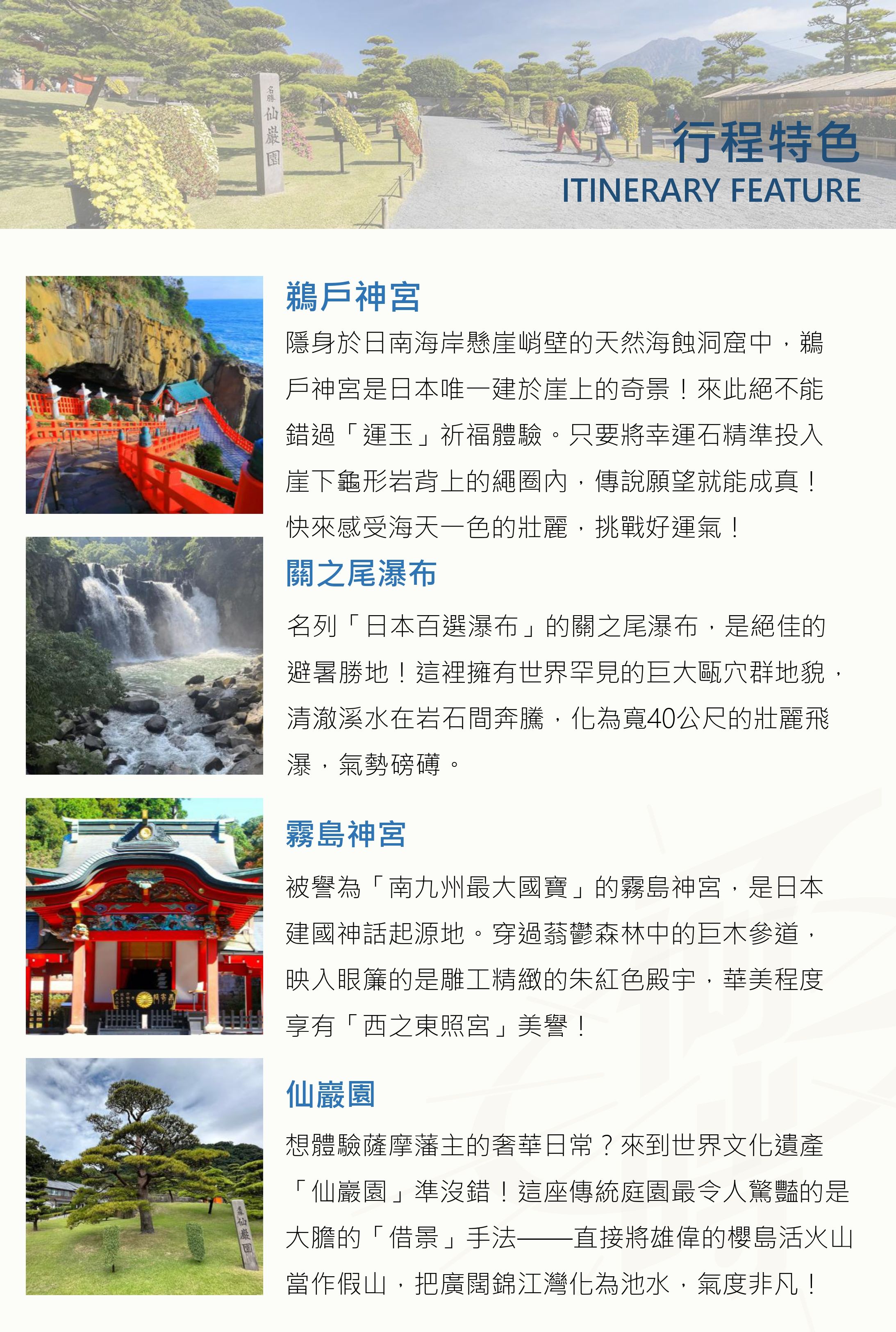 A: 當然有!何時旅遊深知夏日旅遊的痛點,因此特別將「避暑」與「消暑」融入行程基因中。我們帶您走入名列日本百選的「關之尾瀑布」,享受天然負離子的冷氣;更貼心安排在鹿兒島天文館通散策時,為每人送上道地的「白熊冰」。用清涼的飛瀑水氣與綿密香甜的冰霜,為您打造一個舒適且充滿歡樂氣氛的南九州之旅。