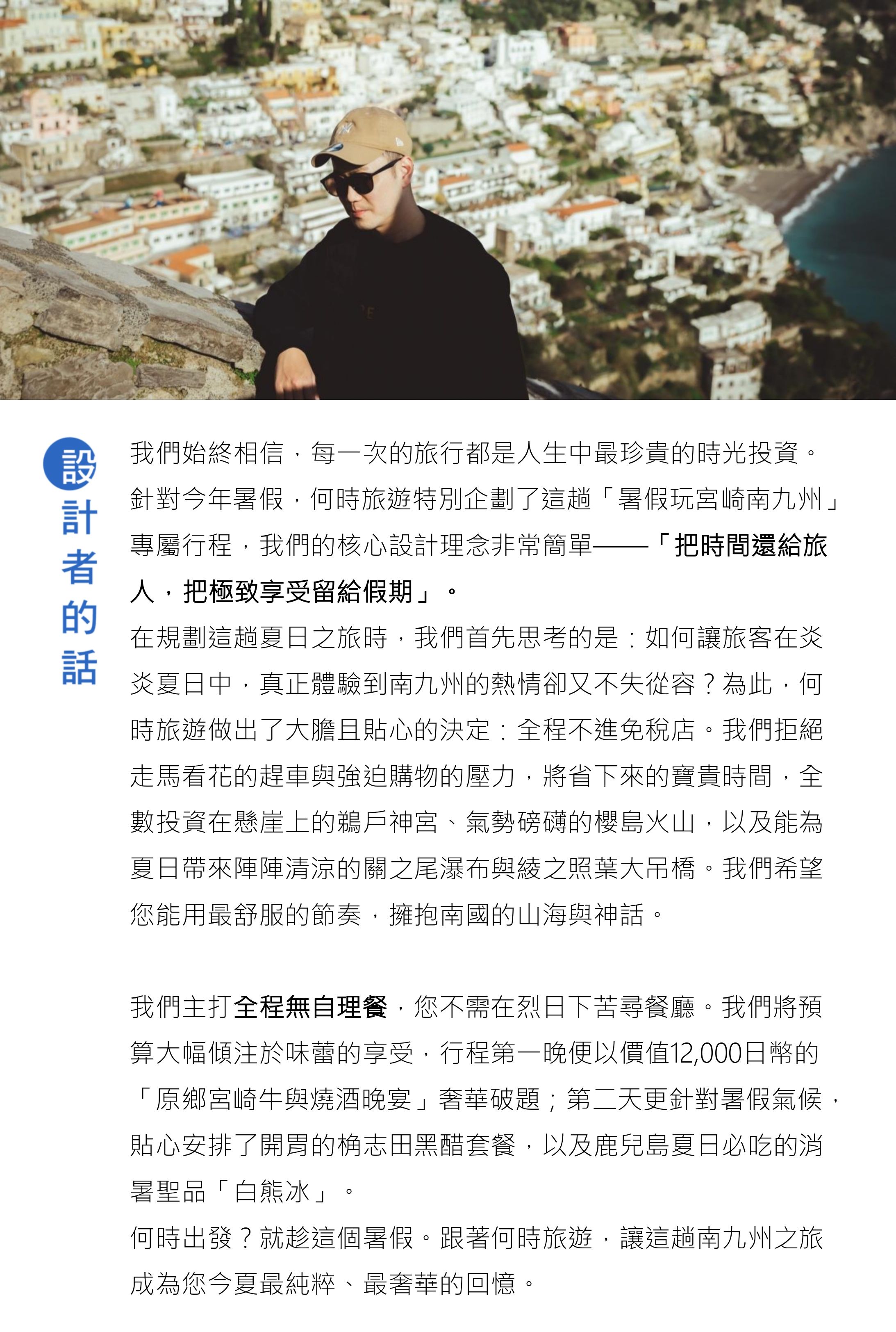 A: 我們始終認為,旅行的時間是最無價的資產!尤其南九州充滿了大自然的鬼斧神工與神話色彩,何時旅遊寧可捨棄購物站佣金,也要把寶貴的時間全數還給您。不進免稅店,意味著我們能更從容地漫步在絕美景點中,不受強迫購物的壓力束縛,讓您的夏日假期擁有最純粹、最高品質的放鬆感,把時間都投資在美好的回憶上!