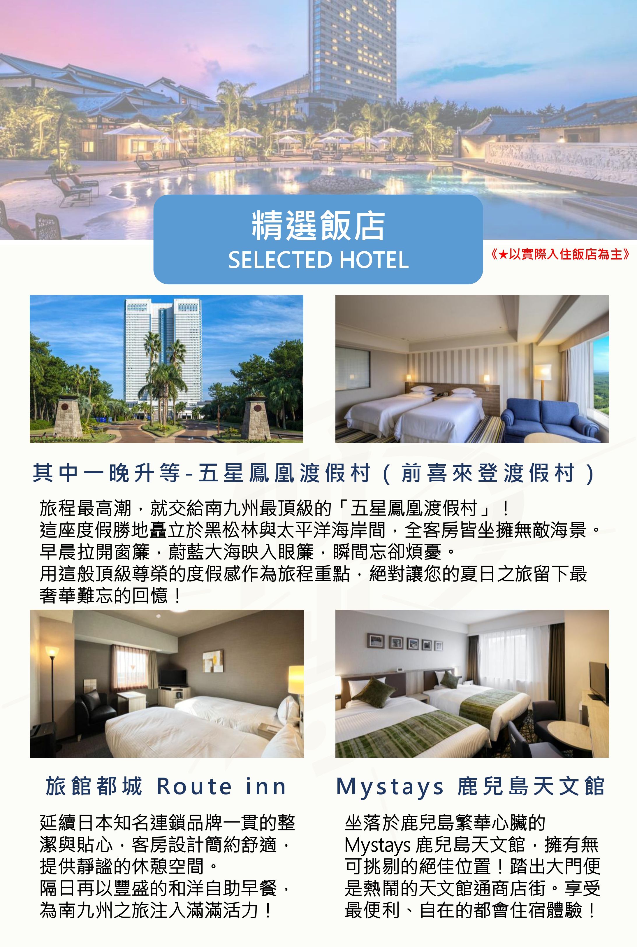 旅程的最高潮,我們為您保留在南九州頂級的「五星鳳凰渡假村」!。何時旅遊精心安排您下榻於此,早晨拉開窗簾便能迎接湛藍大海。用這般尊榮的度假氛圍作壓軸,絕對讓您留下最奢華難忘的夏日回憶!