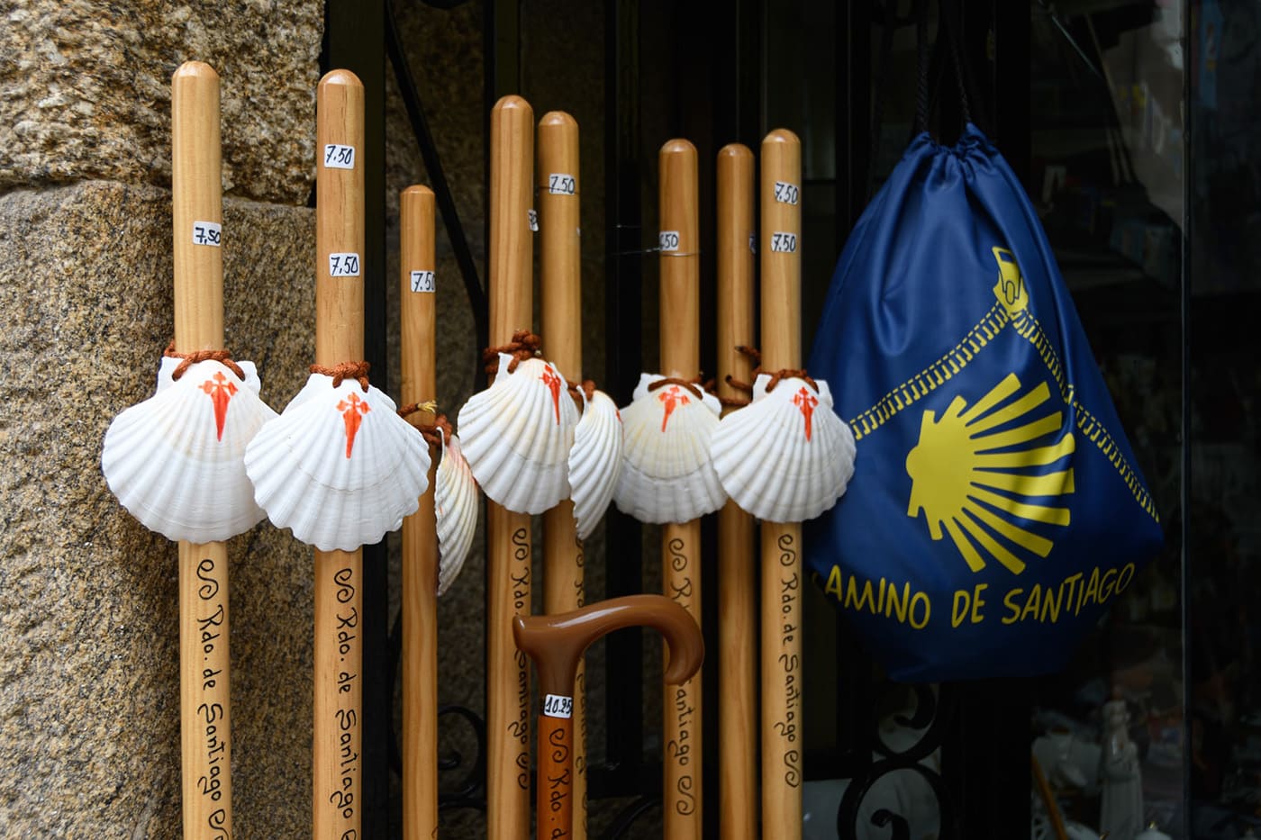 銘黃色箭頭與貝殼圖樣是朝聖之路的代表標誌。相傳載著聖雅各屍體的船舶靠岸時,有人不慎落海,卻因貝殼簇擁而不致沈沒。此後貝殼就成了聖雅各之路的守護象徵。朝聖之路的圖案也是由貝殼發展而來,相會於一點的放射狀線條象徵著無論從何而來,走上何路,朝聖者們終將殊途同歸,相會於聖地牙哥。