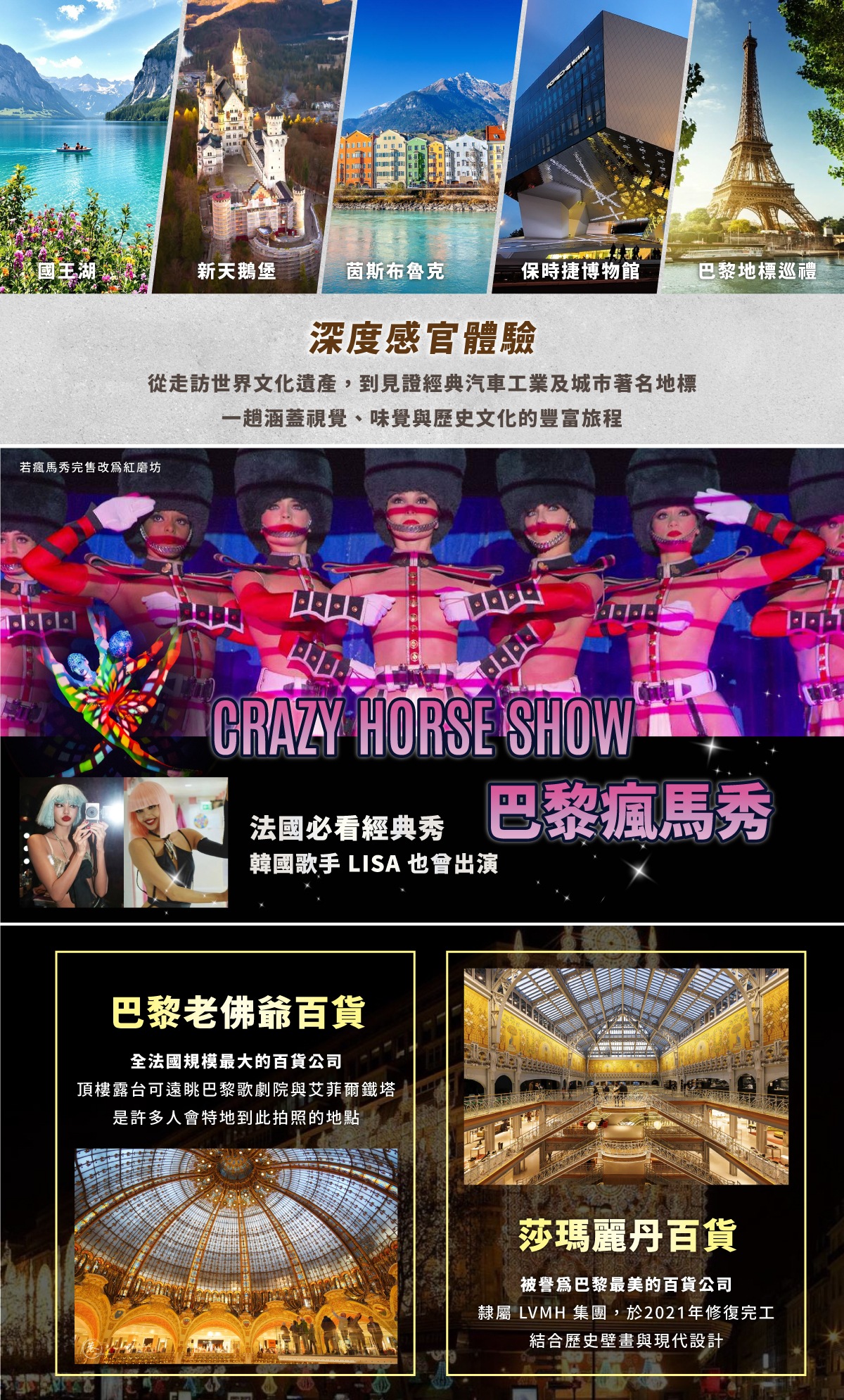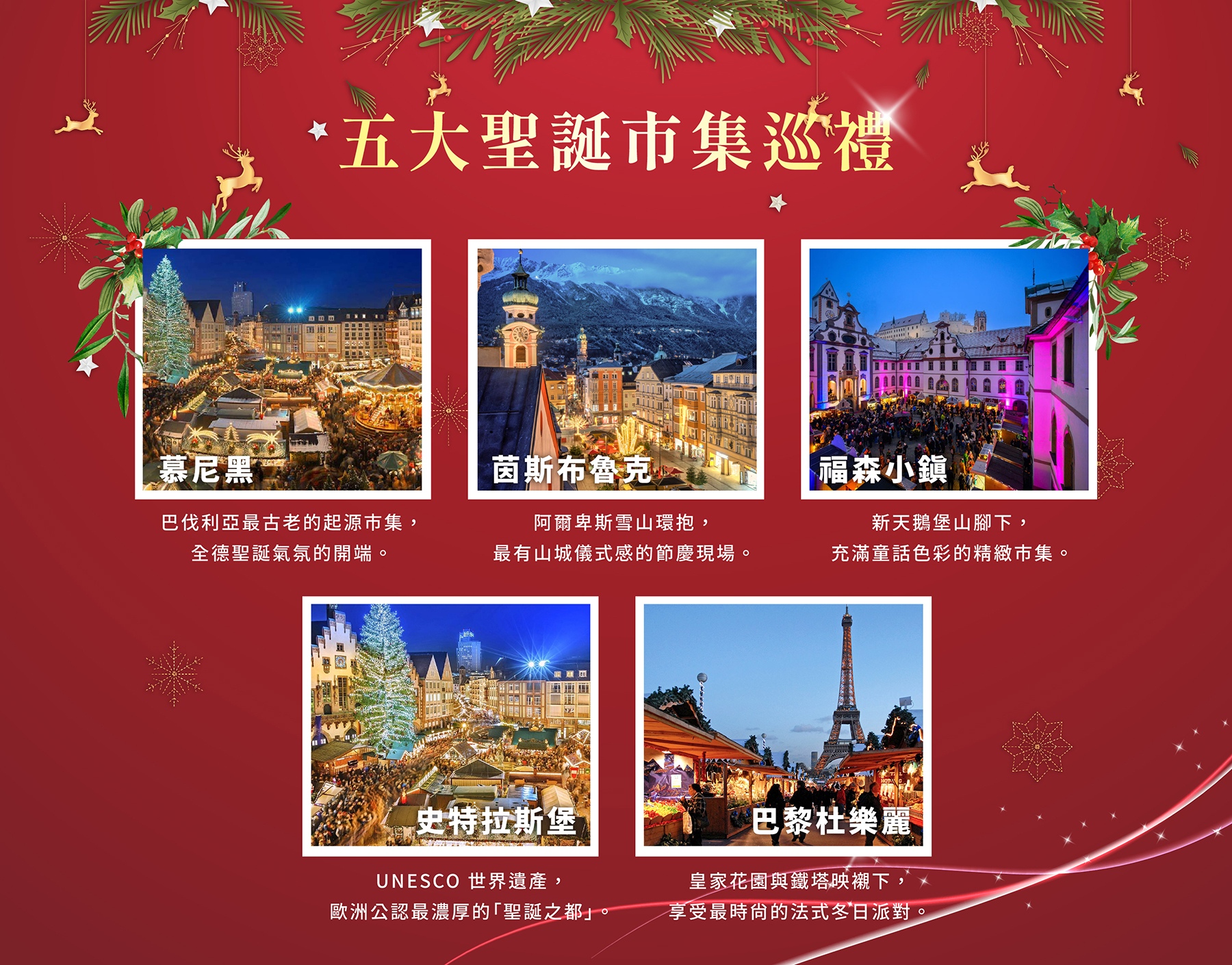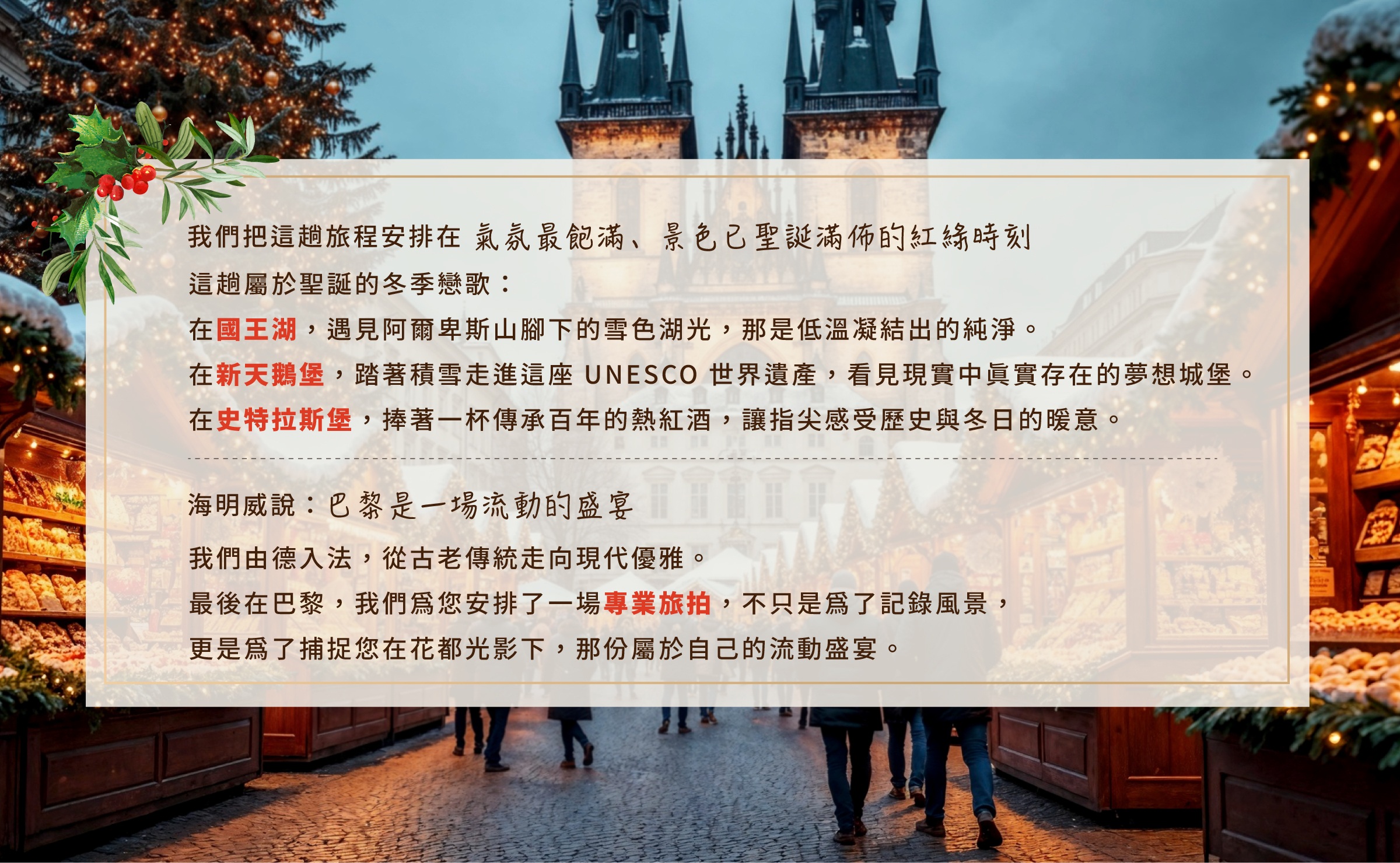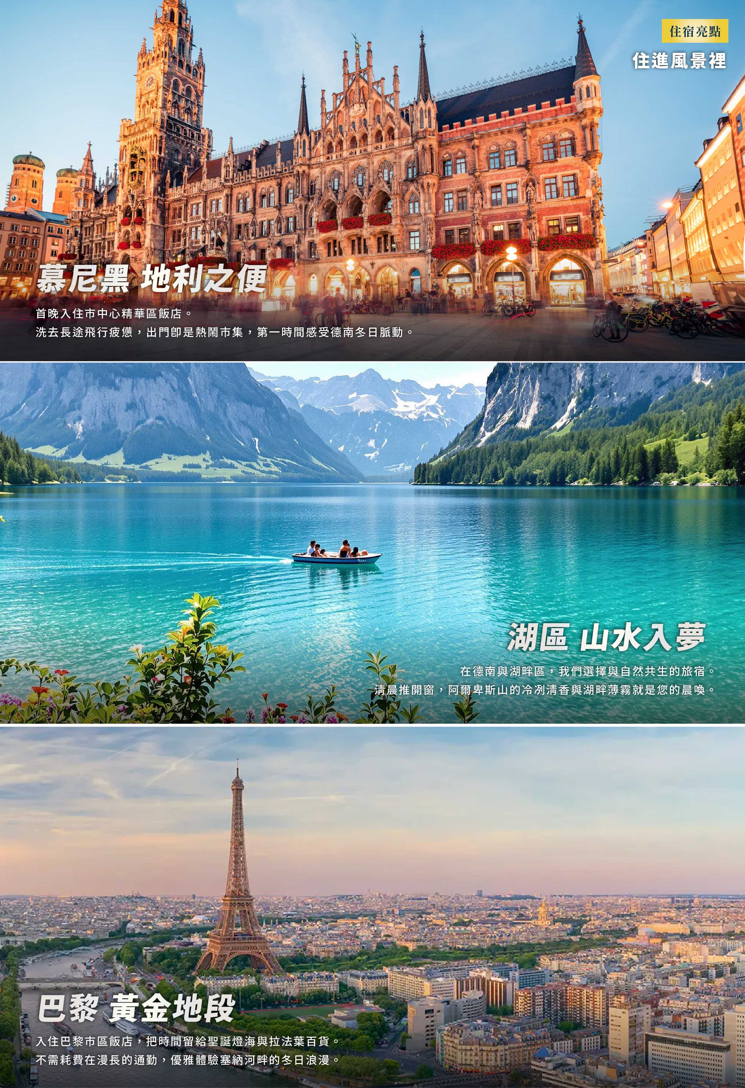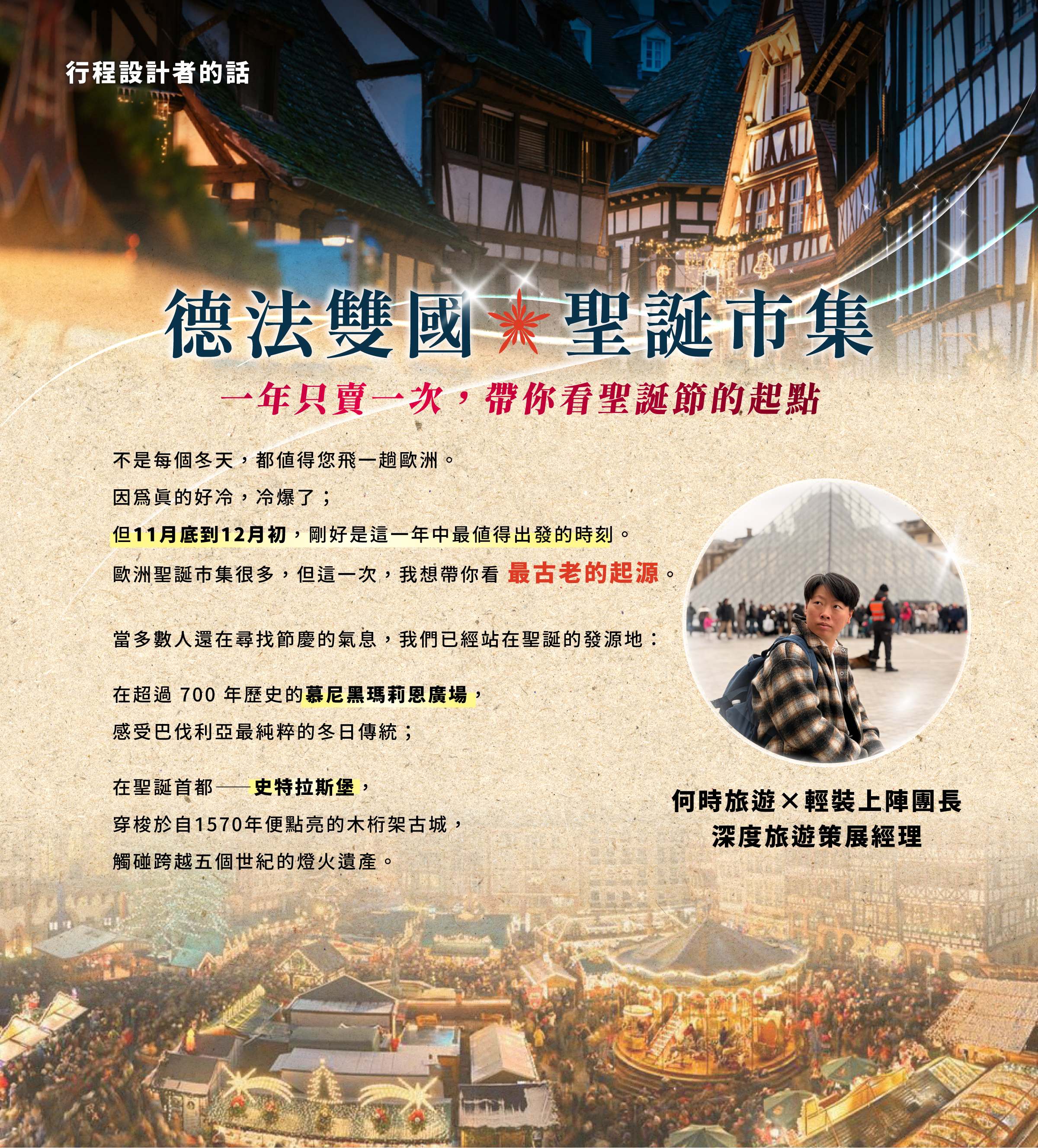 A1:這趟何時旅遊×輕裝上陣為您設計的德法雙國聖誕市集12日,特別安排搭乘長榮航空直飛班機,免去轉機的折騰。我們更採用「慕尼黑進、巴黎出」的雙點進出規劃,不走回頭路,把時間完全留給最真實的歐洲旅遊體驗。