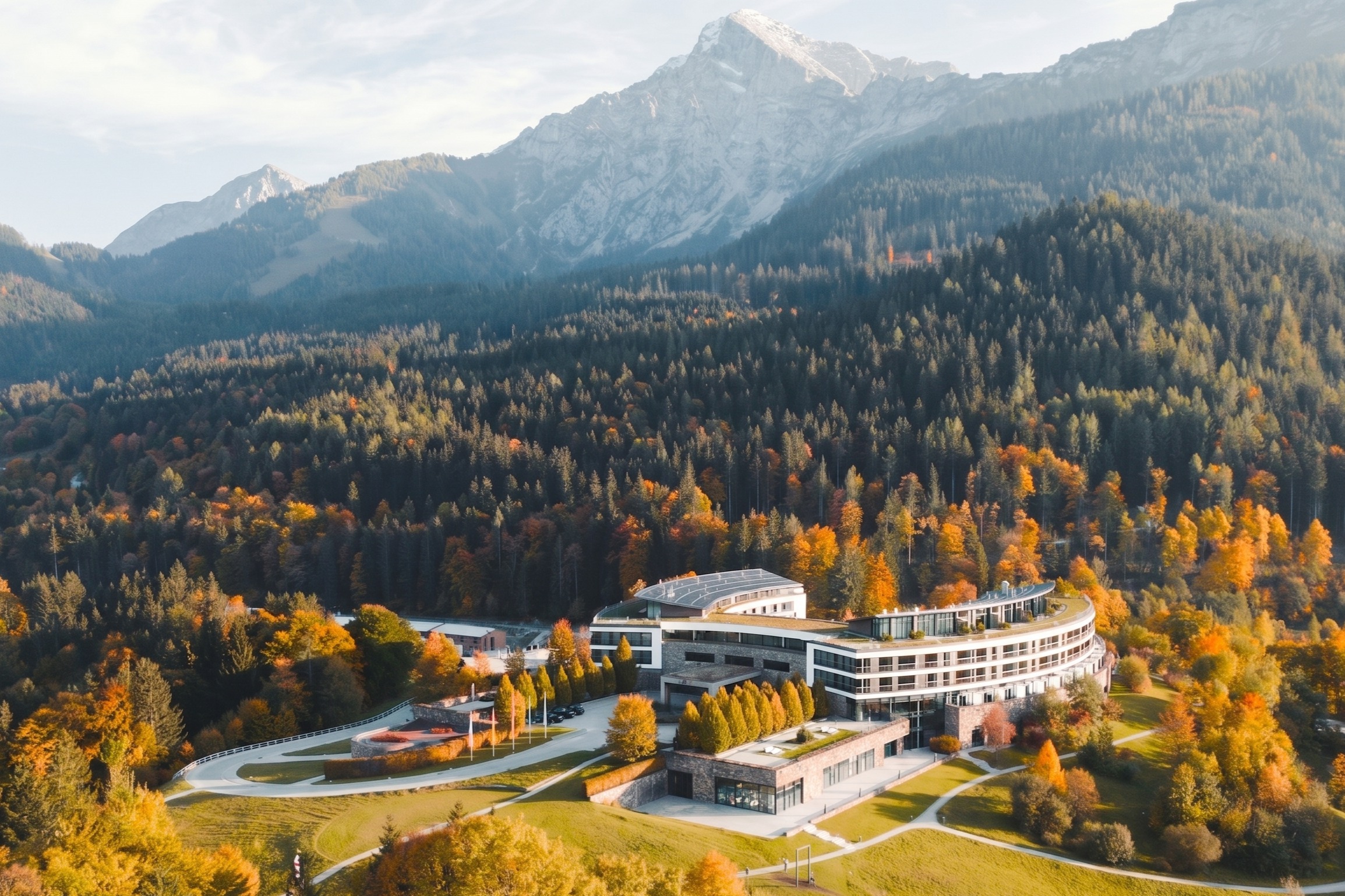 這座酒店坐落於海拔 1,000 公尺的奧伯薩爾茲堡山脊上,其地理位置具有深厚的歷史份量。酒店採特殊的馬蹄形建築設計,這並非單純為了造型,而是為了確保每一間客房都能以最佳角度與周圍的巴伐利亞阿爾卑斯山脈進行「對話」。這裡強調的是一種從歷史沉重感轉向自然療癒的純淨體驗,讓旅人在壯闊的群山環抱中,尋得一場身心靈的儀式感停留。