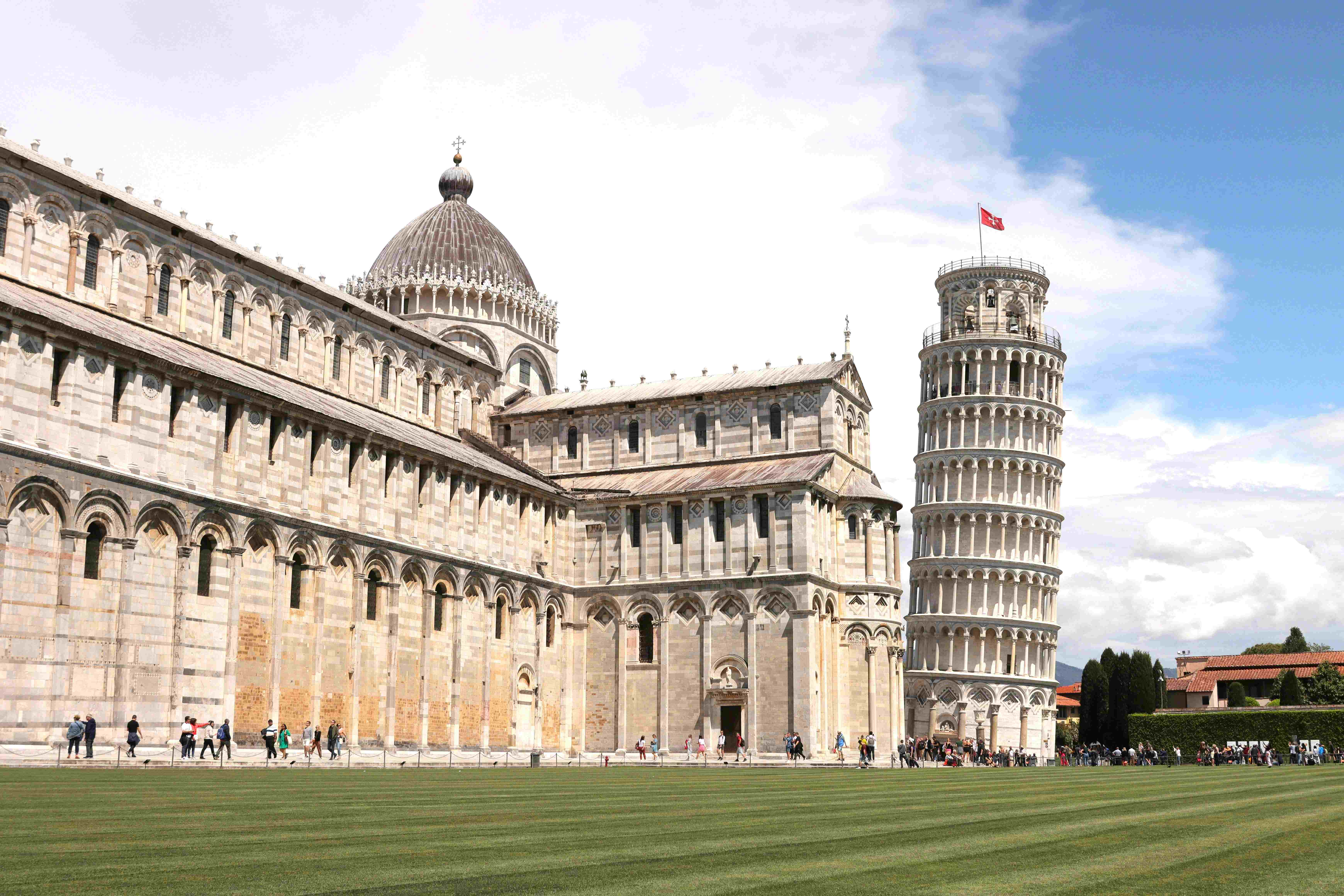 比薩斜塔位於世界文化遺產「奇蹟廣場」上,原為比薩主教座堂的獨立鐘樓。這座羅馬式建築始建於 1173 年,因地基土壤鬆軟,在建造初期便開始傾斜,卻意外成為全球最知名的建築奇觀。斜塔高約 56 公尺,外觀由潔白大理石砌成,環繞著優雅的連續拱廊。