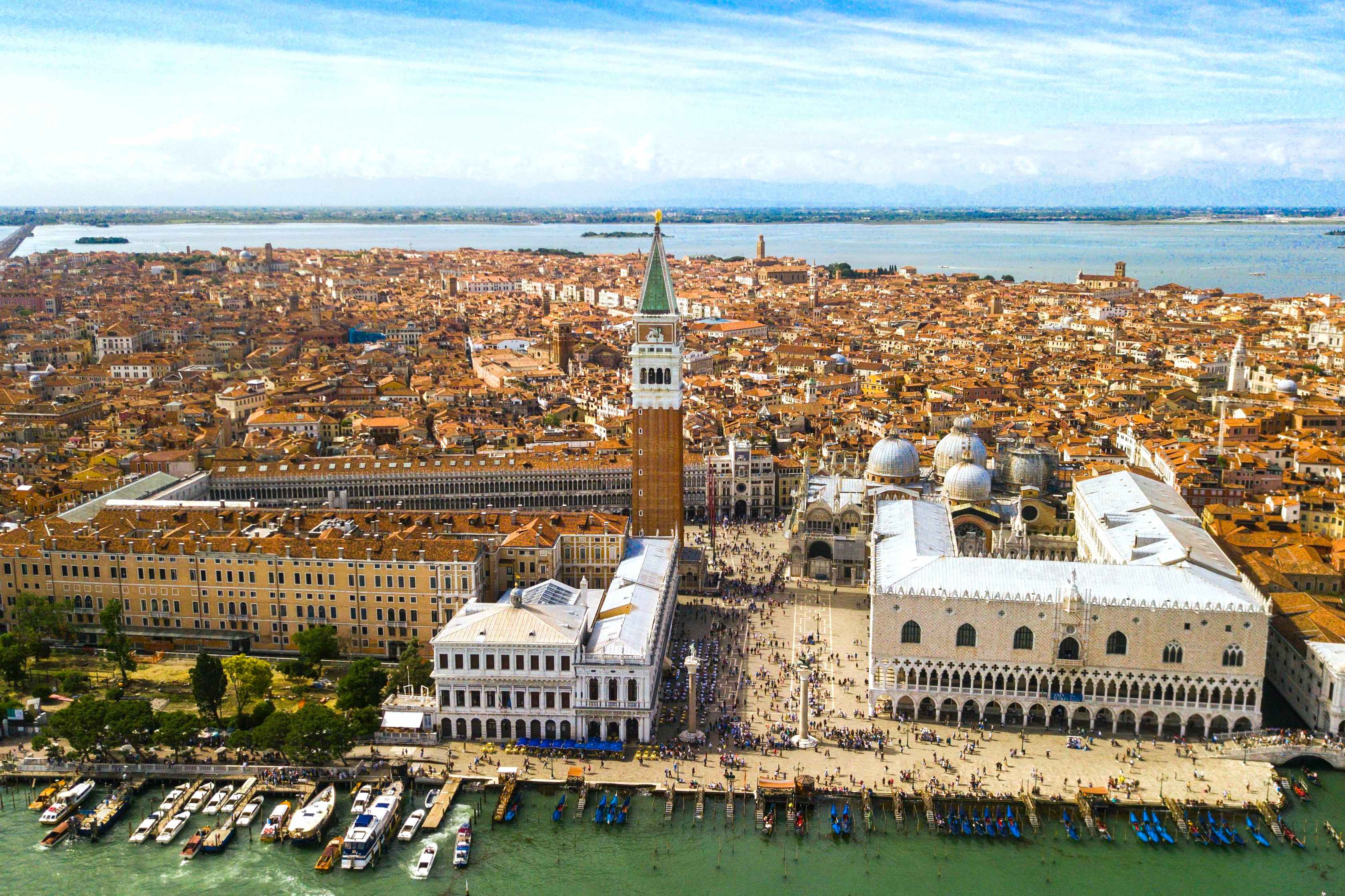 被拿破崙譽為「歐洲最美客廳」的聖馬可廣場,是威尼斯的政治、宗教與文化中心。廣場三面被宏偉的建築環繞,匯聚了水都最核心的地標。其中最耀眼的是融合拜占庭等多元風格的「聖馬可大教堂」,內部鑲嵌著大面積的黃金馬賽克壁畫,展現昔日威尼斯共和國的輝煌。緊鄰一旁的是 98 公尺高的聖馬可鐘樓,登頂可俯瞰潟湖全景。來到此處,不妨伴著百年咖啡館的露天音樂,感受這座水上之都的繁華。
