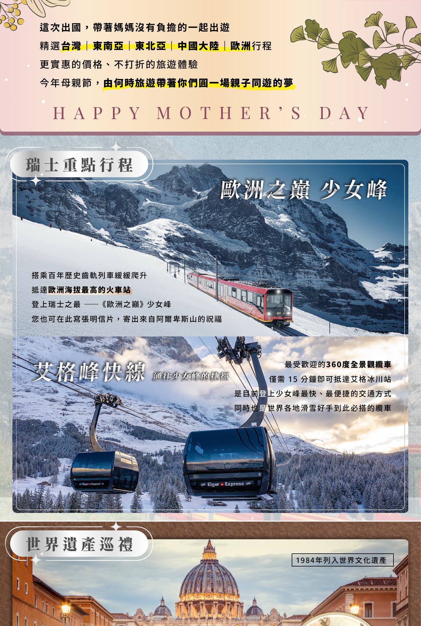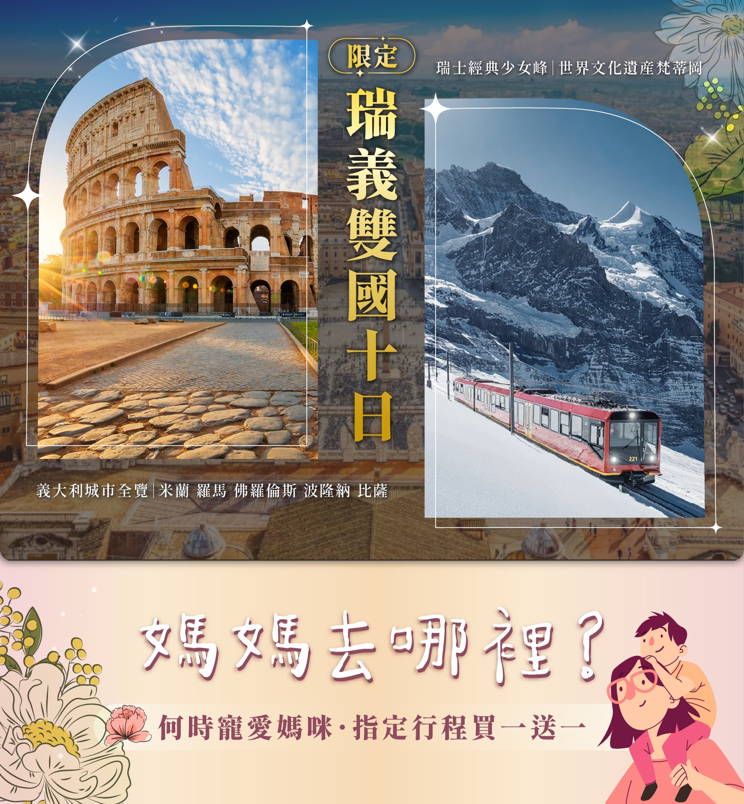 【母親節買一送一】瑞義雙國10日|瑞士少女峰艾格峰纜車、梵蒂岡、義大利經典,羅馬、佛羅倫斯、威尼斯、比薩、米蘭,無自理餐
