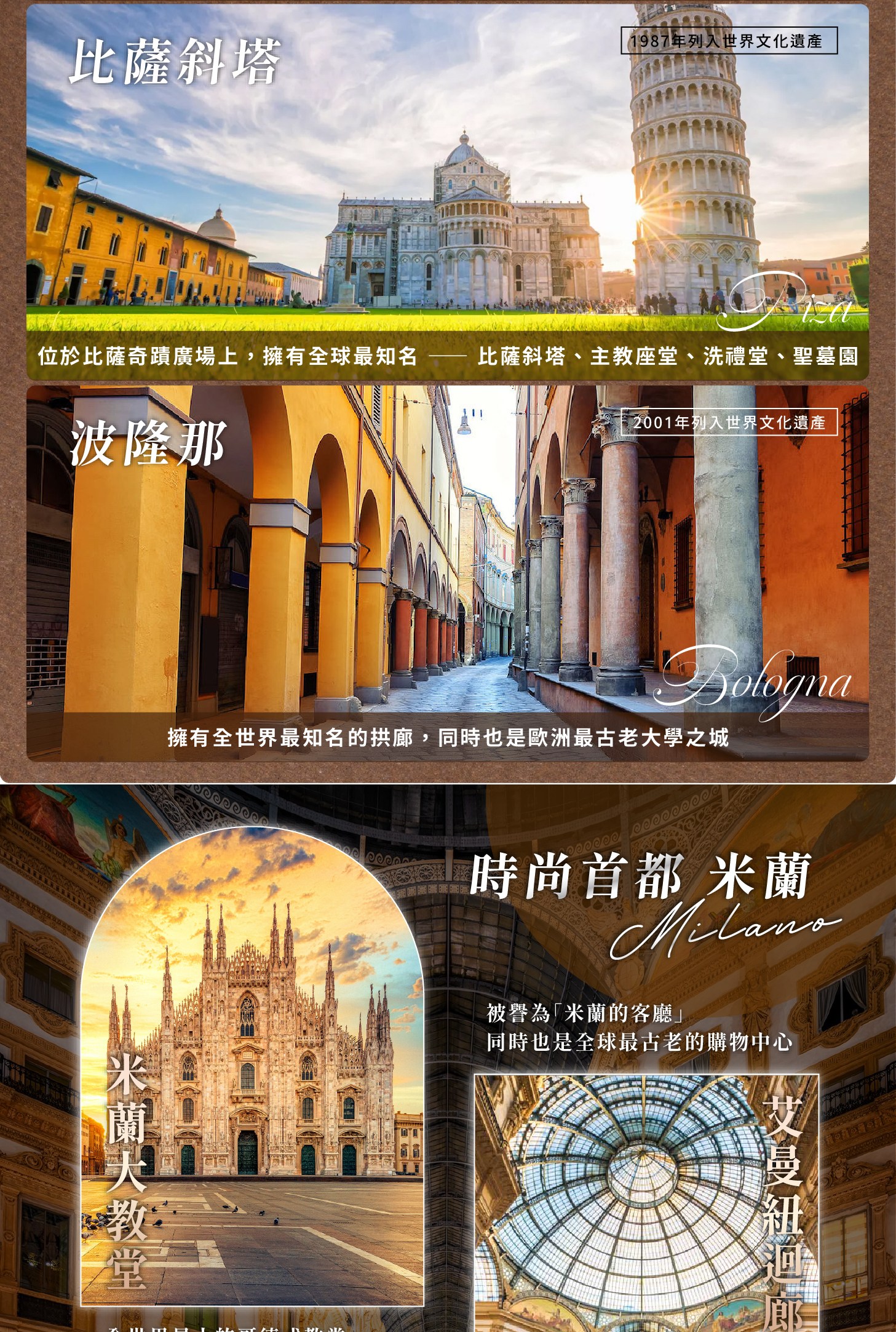 波隆那Bologna → 160公里(約2.5小時)威尼斯Venice → 威尼斯市區觀光|威尼斯聖馬可廣場、嘆息橋、總督宮 → 290公里(約3.5小時)米蘭Milan