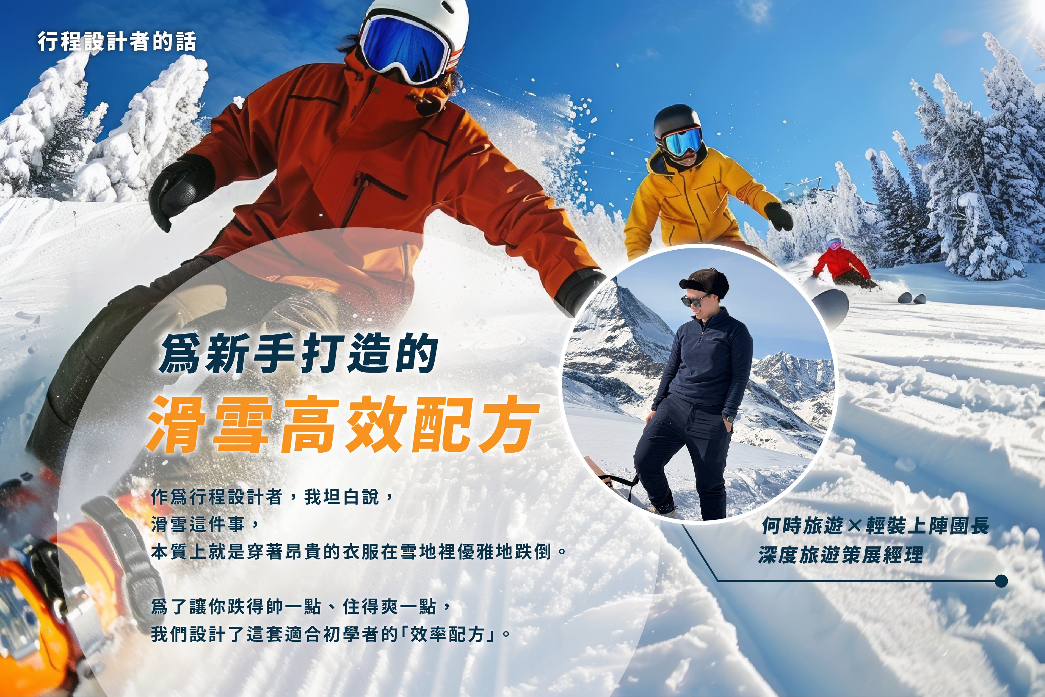 A3:語言不通絕對是滑雪新手的致命傷!以前聽過太在冰天雪地裡聽不懂教練指令,真的會超級沒安全感。所以輕裝上陣特別安排「專屬中文教練」,用母語教學就是安心。教練不只帶你練技巧,還會教你判讀白馬的地形跟雪場禮節,溝通零誤差,讓你在雪上的每一刻都充滿餘裕。