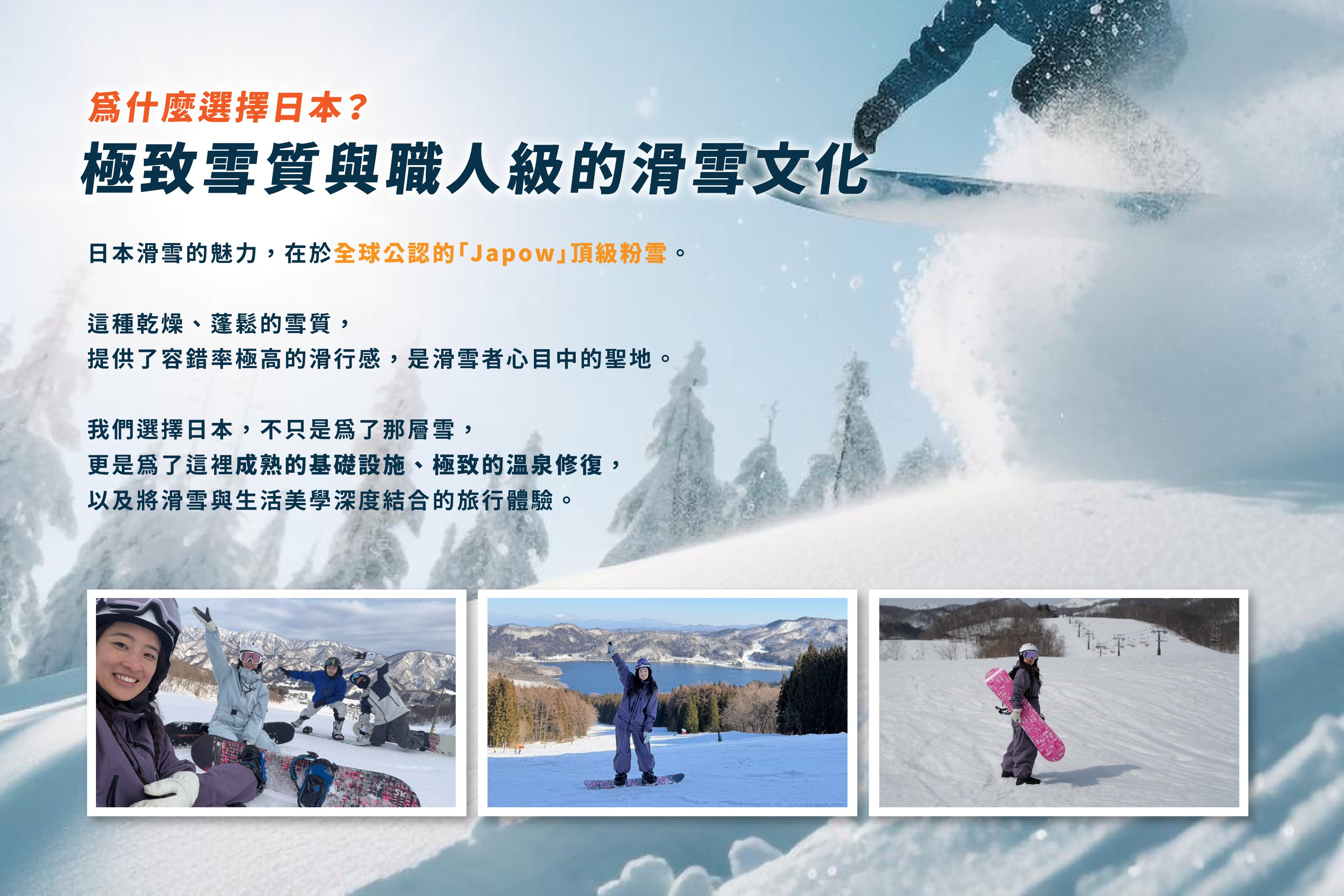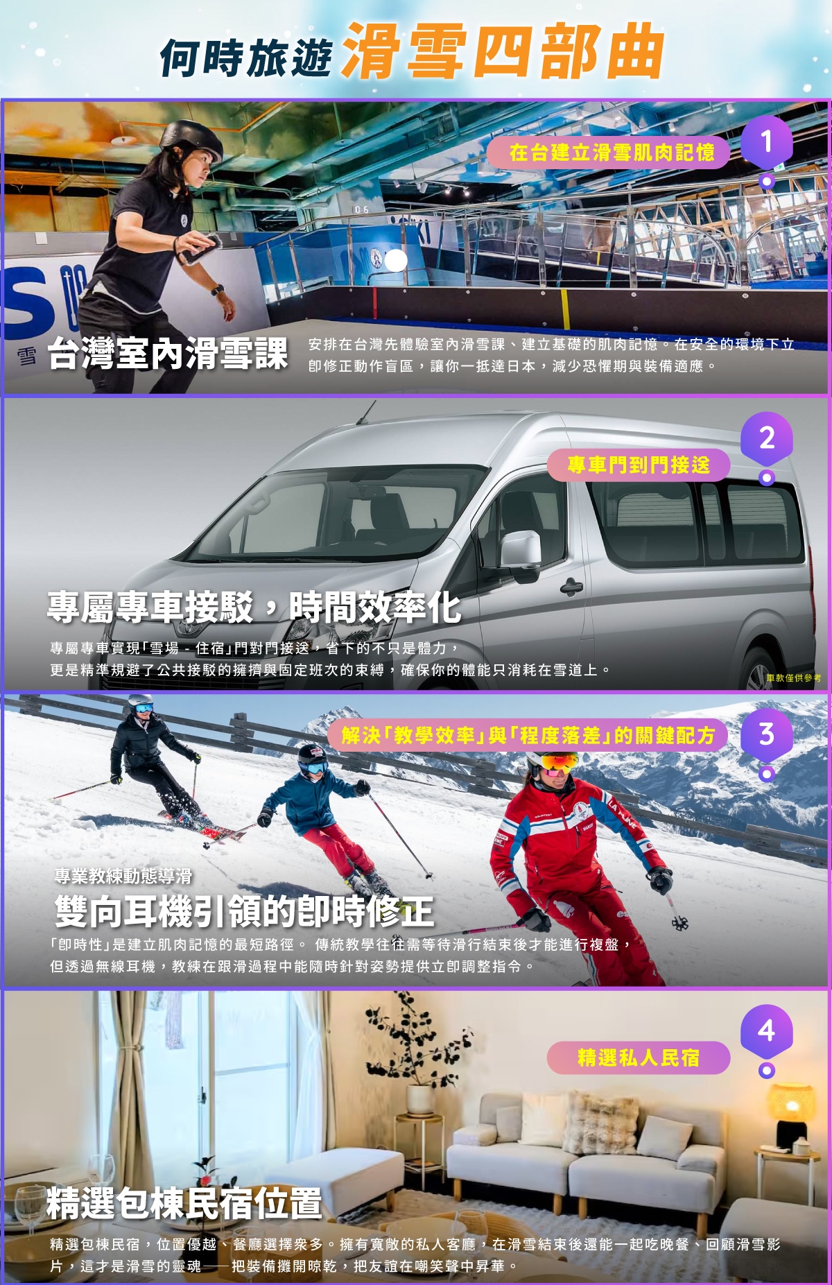 真正的雪國之旅,從出發前就已經開始。為了讓您在白馬面對浩瀚雪山時,不被初學的焦慮佔據,輕裝上陣特別安排台灣室內滑雪課程。在熟悉的環境裡,先讓身體記住滑行的律動、感受雪板的邊刃。我們把跌倒的慌亂留在台灣,把最從容的狀態與期待,留給日本的頂級粉雪。