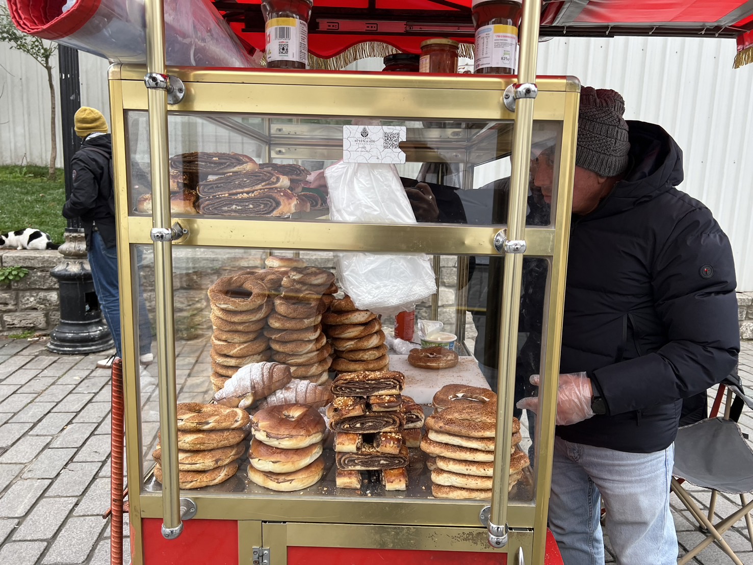 Simit 是土耳其最具代表性的街頭小吃之一,也是伊斯坦堡人日常生活中的必備點心。它類似於貝果,但外層裹滿了芝麻,外酥內軟。當地人通常會搭配土耳其茶或乳酪一起享用,作為早餐或簡便的小食。